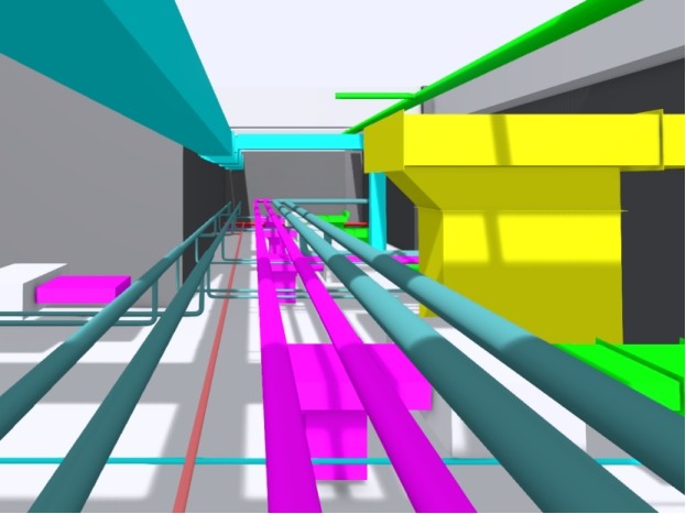 復因項目建筑面積6000平方米,其中凈化廠房面積2500平方米,主體結構以潔凈工程為主,存在夾層空間較小從而導致管道密集的問題。天俱時集團BIM中心團隊為解決這一難題,助力業主在后期清晰分辨送風與排風系統以提高維護效率,通過BIM技術將送風與排風管道分別設置于兩個不同的高度層面,大大提高了送排風系統的空間管理性。